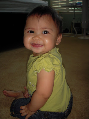 I'm proud to say Fiona's able to do many marvelous things this month. She's sitting up ( much more stable this time), crawling commando style with her own twist to it, standing up and grabbing anything to lean on ( no steps yet), and adding more food to her palette such chicken, turkey, tinola ( a Filipino dish), Yo Baby ( just a taster to see if she has any allergic reactions to milk and she doesn't), and watermelon. She loves melons, especially cantaloupe. She also makes this funny face to make others laugh. She crinkles her nose and squints her eyes as if she's just bitten into a lemon. It's a hilarious sight. One more neat thing, Fiona bobs her head to music. She's got a rhythm of her own.